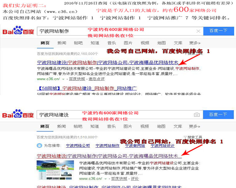 浙江省寧波市是千萬人口的大城市,約有600家網(wǎng)絡(luò)公司,競爭異常厲害,“寧波網(wǎng)站建設(shè)”“寧波網(wǎng)站制作”這二個關(guān)鍵詞,本公司網(wǎng)站多年來基本上百度快照排在第1名(360搜索也多數(shù)排名在1名)...